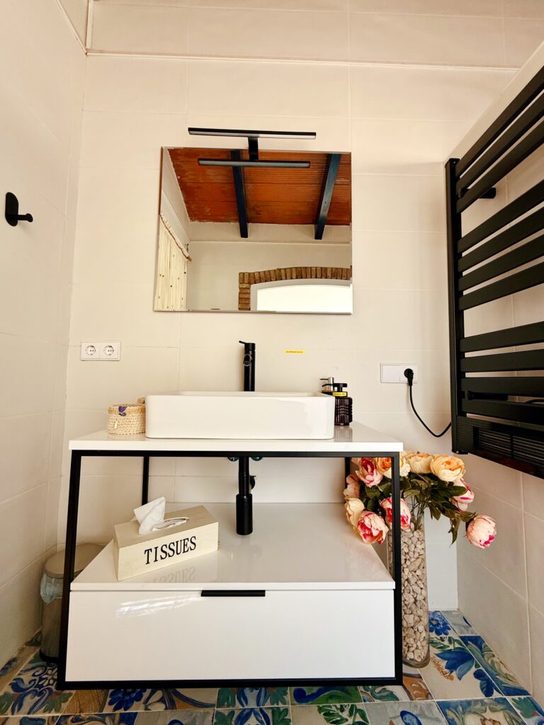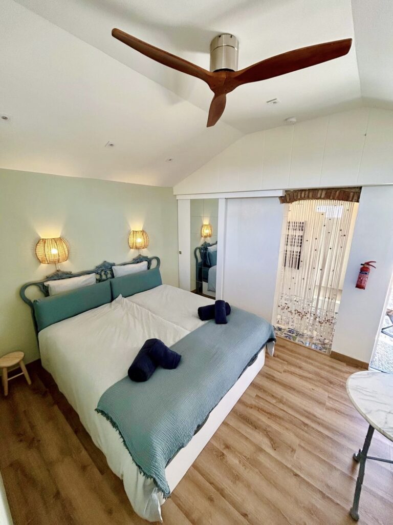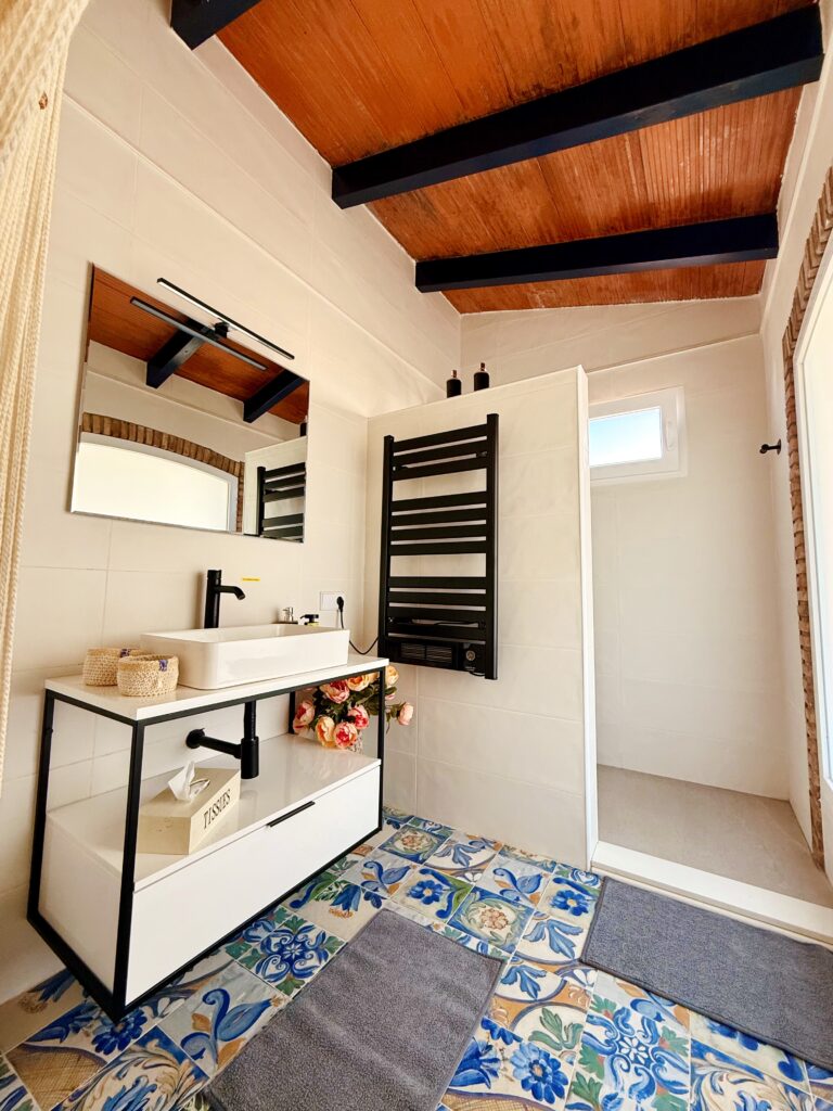 Esta habitación tiene una cama doble de 1m80x2m y un baño con aseo independiente: La habitación tiene una amplia terraza privada con zona de estar y tumbona, una pérgola con un banco en la entrada, y también hay espacio para que se sienten 2 personas en el interior.